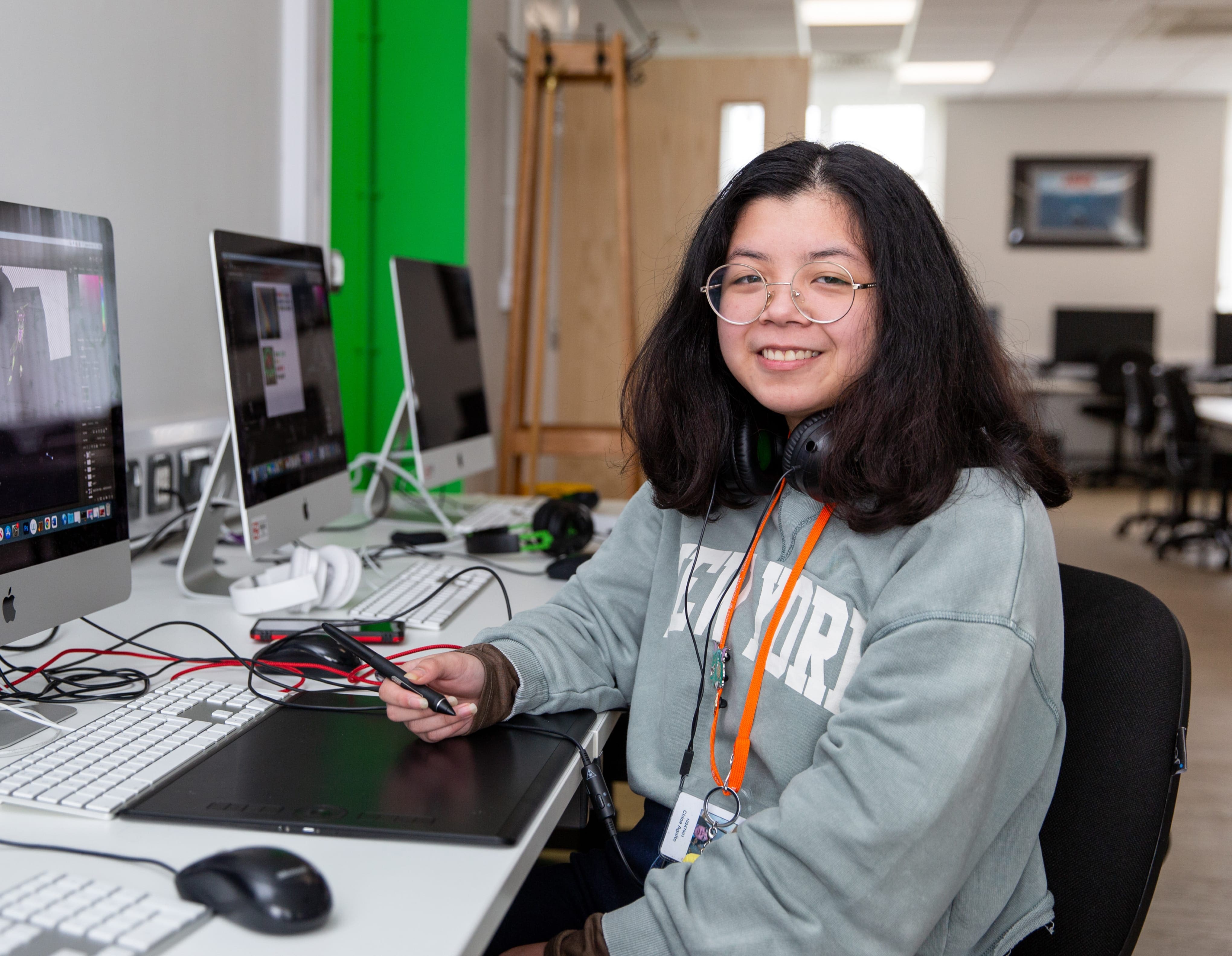 Y peth gorau am Goleg Gwent yw'r cyfleusterau, doeddwn i ddim yn disgwyl gweld cymaint o gyfrifiaduron uchel-spec, Macs, Wacom, neu hyd yn oed VRs. Gallwch ddefnyddio eich dychymyg gymaint ag y dymunwch, cyn belled â bod y gwaith yn dilyn y briff. Mae'n ddiderfyn!